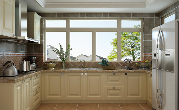 歐式整套櫥柜以做舊的歐式線條,將整體設(shè)計(jì)提升格調(diào),大量定制的地柜和吊柜,提升了廚房的儲(chǔ)物功能,L型動(dòng)線分布,讓烹飪更隨心意。